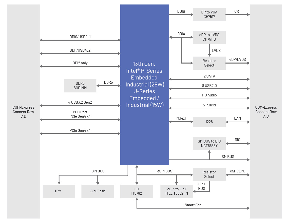 Плата формата COMe Type 6 , процессор intel Core i3-1315UE 1.2 ГГц, 1xDDR5 SO-DIMM до 32 Гб, 3xDDI, VGA, eDP/LVDS, 2,5GLAN, 2xSATA III, 8xUSB2.0, 4xUSB3.2, 2 x USB 4 by TCP Ports (Optional by BIOS),2 x PCIe x4 (Gen4), Only for SSD, (From CPU)