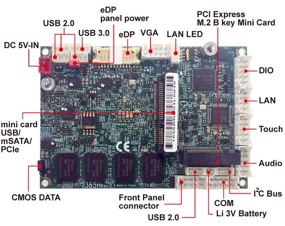 1I385H-I22-00 Одноплатный безвентиляторный компьютер формата 1,8", все разъемы на пинах, процессор Intel Atom E3825 1.33Ghz (запаян), 2Гб ОЗУ, VGA, GLAN, 1xRS232, mSATA, 1xMINI PCI-E, M.2 слот, 3xUSB, 4 x DI / 4 x DO, eDP, контроллер сенсорного экрана, Audio, питание 5В, расширенный температурный диапазон -20...70