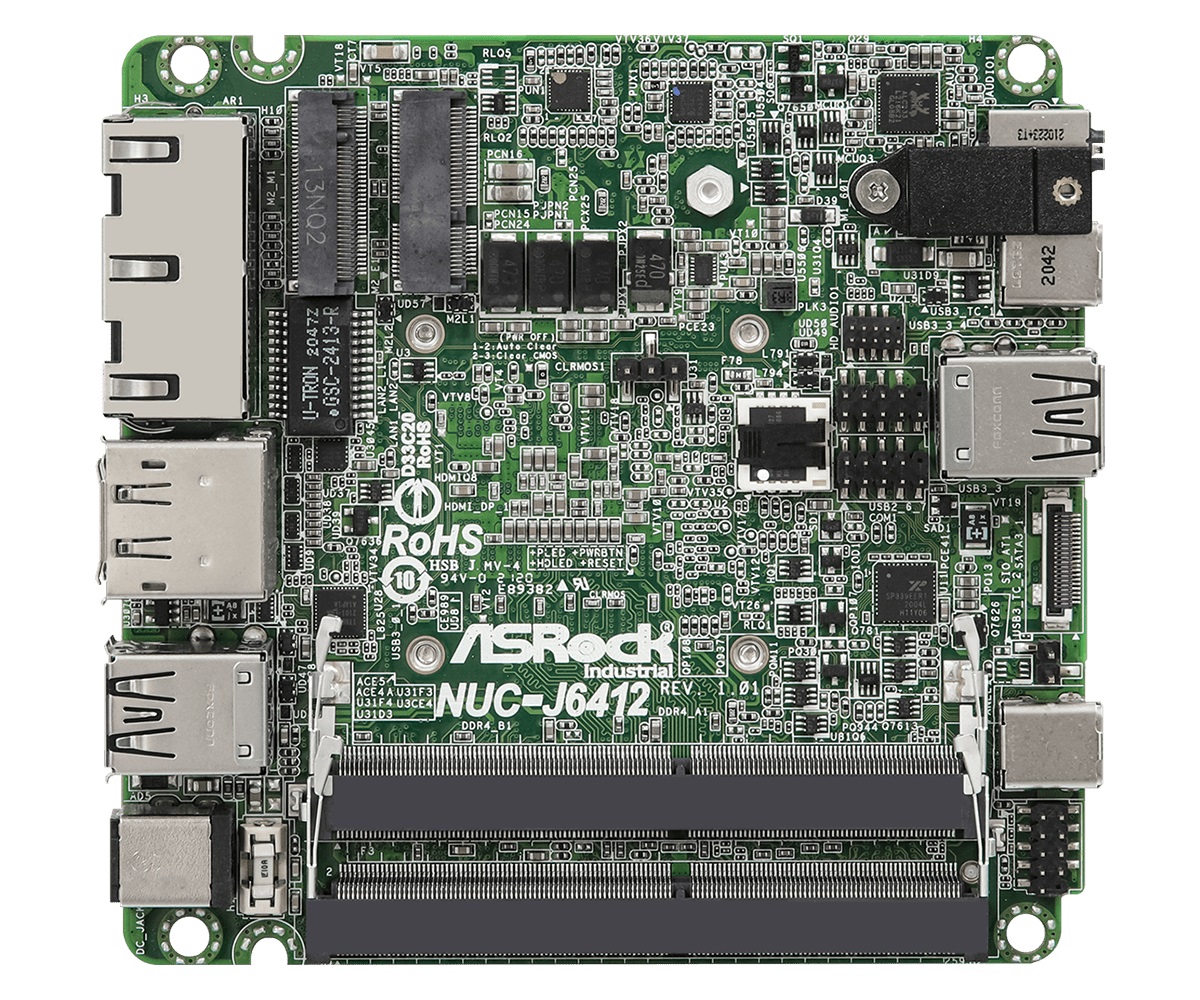 NUC-J6412 Промышленная материнская плата формата NUC, процессор Intel Celeron J6412 2.6ГГц, 2x DDR4 SO-DIMM max 32G, DP, HDMI, 2xGLan, 1xSATA, 1xCOM, 1xM.2 Key M, 1xM.2 Key E, 4xUSB 3.2 Gen2, 4xUSB 2.0, HD Audio, WD Timer (Сторожевой таймер), питание 12...19В