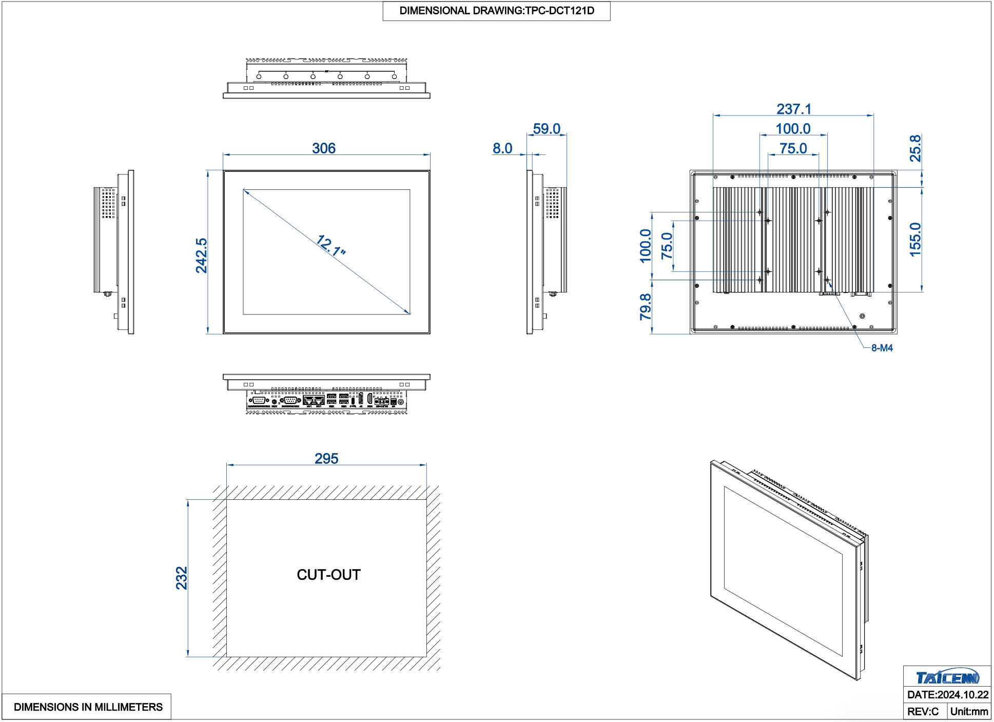 TPC-DRT121D3 Безвентиляторный панельный компьютер 12.1" c резистивным сенсорным экраном 1024x768 (процессор Intel Core i7-1255U 1.7 ГГц предустановлен, 1xHDMI, 1XDP, 2xGLAN, 2xRS232/422/485, 2xUSB3.1, 2xUSB3.0, 1xUSB Type-C, Audio, защита IP65 по передней панели, питание 9...36В, адаптер питания, 1xRemote Switch, расширенный диапазон температур -20...70 ℃)