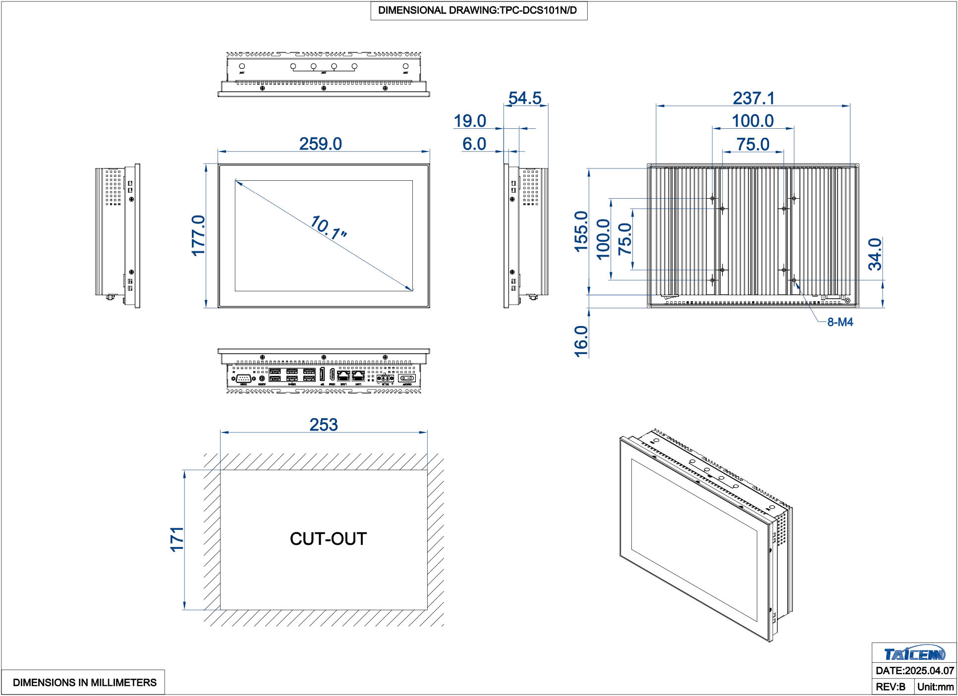 TPC-DRS101N1 Безвентиляторный панельный компьютер 10,1" c резистивным сенсорным экраном 1280x800 (процессор Intel Alder Lake-N N97 3.6 ГГц предустановлен, HDMI, DP++, 2xGLAN, 1xRS232, 2xUSB2.0, 4xUSB3.0, 1хM.2 B-Key 3042/3052 slot; 1хM.2 E-key 2230 slot, Audio, защита IP65 по передней панели, источник питания 12 В, расширенный диапазон температур -20...70 ℃)