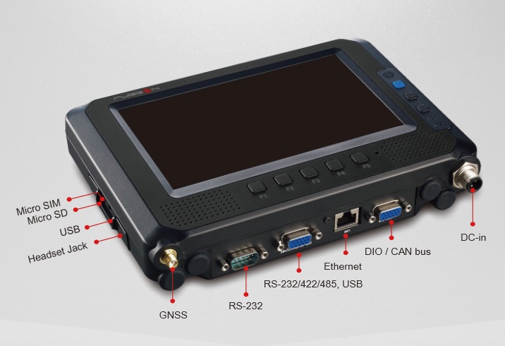 MT7000-LA Безвентиляторный панельный компьютер 7" для применения на транспорте с емкостным сенсорным экраном (процессор Intel Atom E3826 1.46ГГц, ОЗУ 2Гб предустановлено, SSD 64Гб, GLAN, 1xRS-232 + 1xRS232/422/485, USB2.0, USB3.0, CAN, 2xDI + 2xDO, GPS с антенной, Micro SD слот, Micro SIM, Audio, контроль зажигания, защита IP65 (кроме разъемов), питание 9В...36В, встроенный аккумулятор 1950mAh)