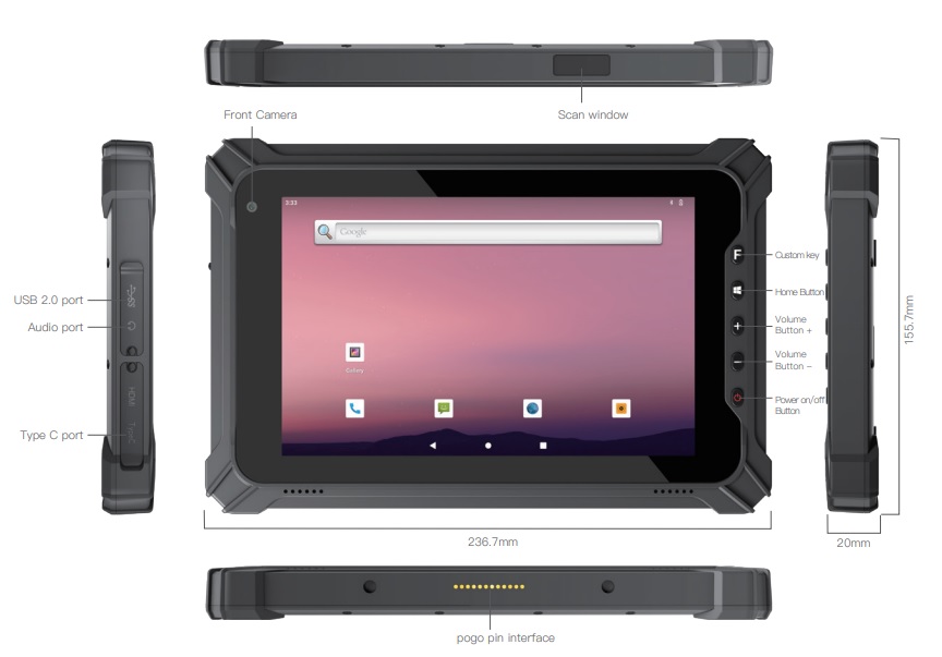 T87X Плантшетная рабочая станция 8" со степенью защиты IP65 (1920х1200, процессор MT6789 (OCTA Core) 2ГГц, 8Гб ОЗУ, 128Гб SSD eMMC, 4G LTE, WiFi 802.11 a/b/g/n/ac (2.4G+5G), Bluetooth 5.2, NFC, GPS/Glonass, USB 2.0, USB Type C, Audio, Sim Socket, MicroSD slot, емкостной мультитач, фронтальная камера 5Мп, тыловая камера 13Мп, Android 12, аккумулятор 10000mAh/3.8V, адаптер питания 9V/2A, расширенный диапазон температур -20...+60)