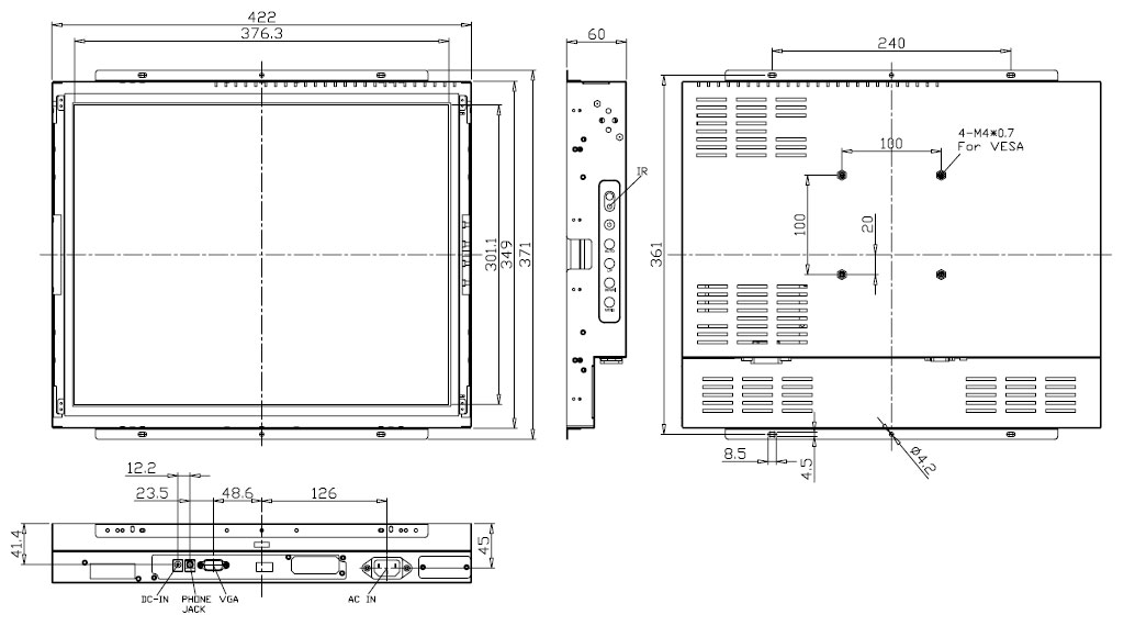 OF1905-EN70L0-00001 19'' TFT безкорпусной монитор для монтажа на плоскость 1280x1024, повышенной яркости 700 нит с подсветкой LED и входом VGA