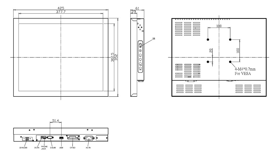 Монтаж на плоскость, VESA-100 Питание 90...260В АС, 32 вт Входной интерфейс VGA, DVI Дисплей Диагональ экрана 19 Соотношение сторон 4:3 Тип дисплея LED Разрешение экрана 1280x1024 Яркость, кд/кв.м 700 Контрастность 800:1 Угол обзора по горизонтали 80-80 Угол обзора по вертикали 80-80 Сенсорный экран Тип сенсорного экрана резистивный Интерфейс сенсорного экрана RS-232 Ресурс MTBF 50000