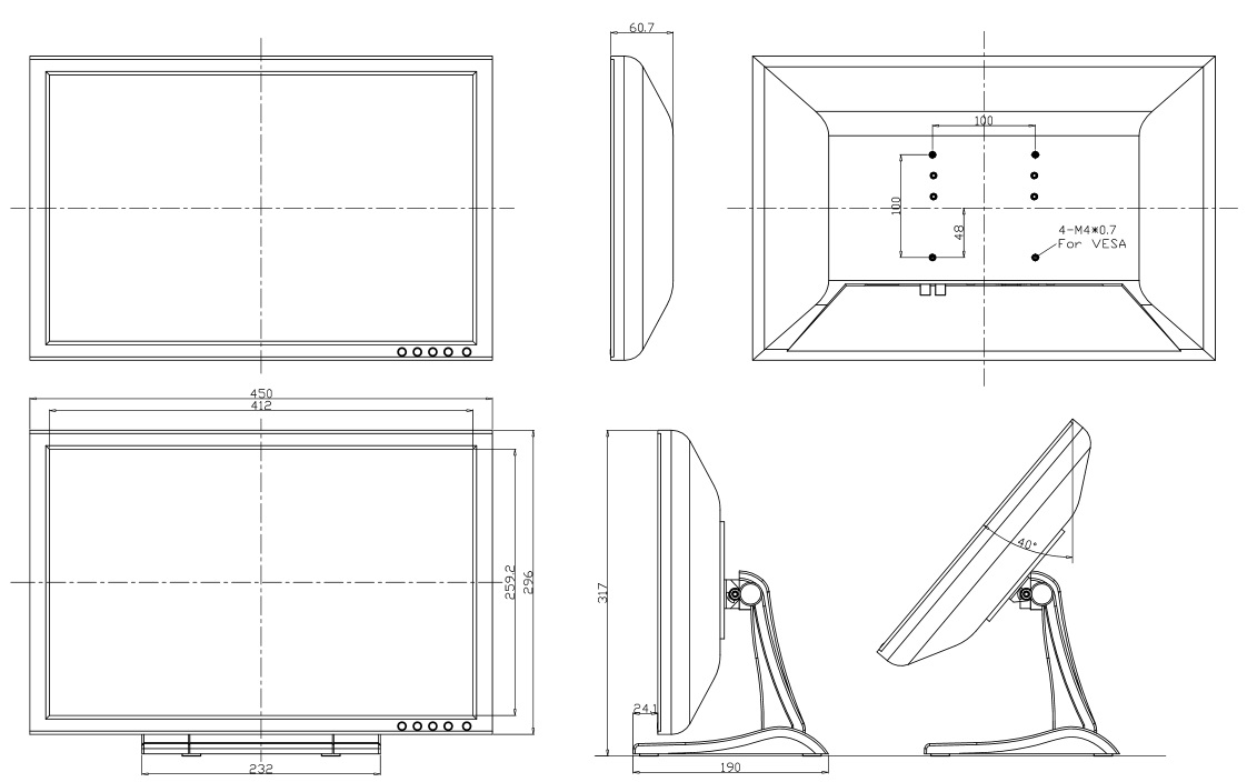 L19W3-WP25L0-00001Настольный дисплей 19'' (16:10) , разрешение 1440x900, яркость 250 нит с входом VGA, 2 динамика 2Вт, источник питания 12В
