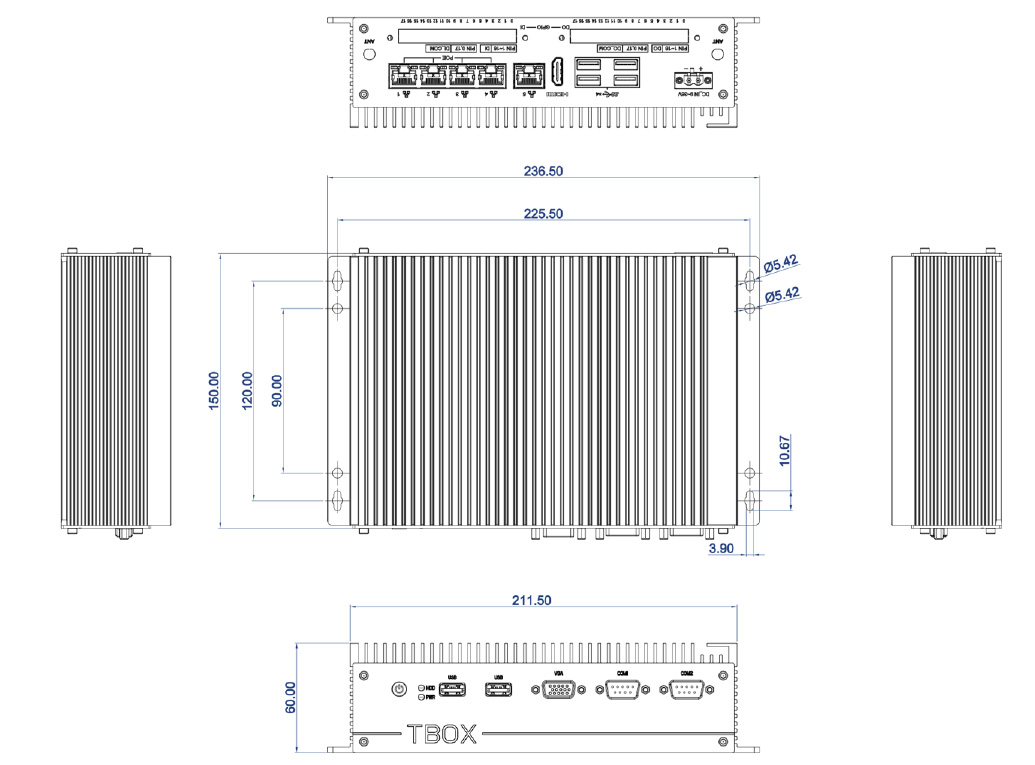 TBOX-3D20 Безвентиляторный компактный компьютер (процессор Intel 12th Gen. Core i5-1235U 1.3ГГц запаян, VGA, HDMI, 5xGLAN (4 c POE), 4xUSB3.1, 2xUSB2.0, 1xRS232, 1xRS485,1 полноразмерный слот Mini-PCIe, слот для накопителя 1x M.2 2280 M-Key slot (PCIe x2 Gen III, NVMe), питание 9...36В DC, источник питания, расширенный диапазон температур -20...60)
