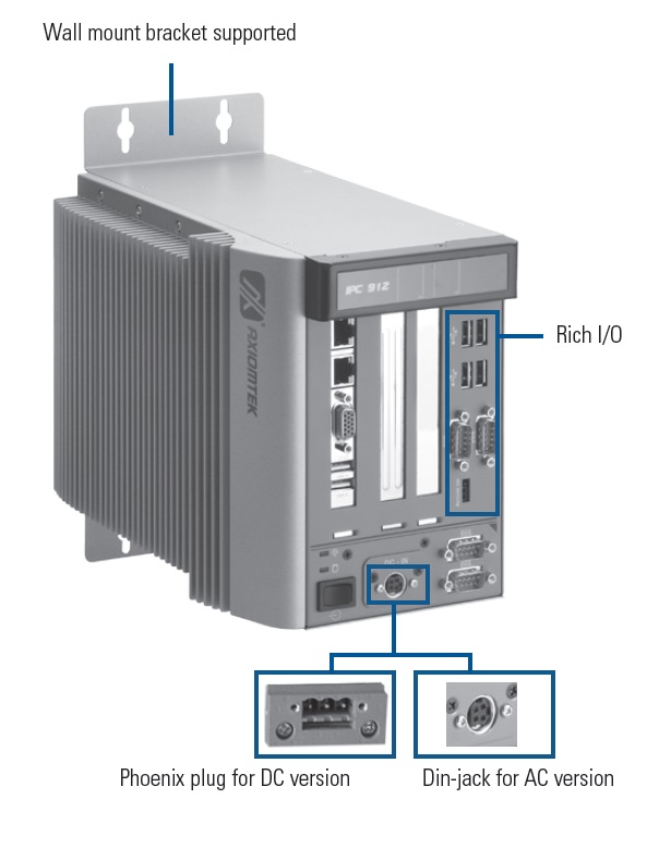 IPC912-213-FL-HAB100 AC Встраиваемый компьютер (процессор 2rd Gen Intel Core i7/i5/i3 Sandy Bridge Mobile, VGA, 2xGLAN, 6xUSB2.0, 3xRS232 + 1xRS232/422/485, SATA, CFast, 1xPCI-Ex1, 1xPCI-Ex4, отсек для накопителя 2.5", питание 10...30В DC, источник питания 150Вт)