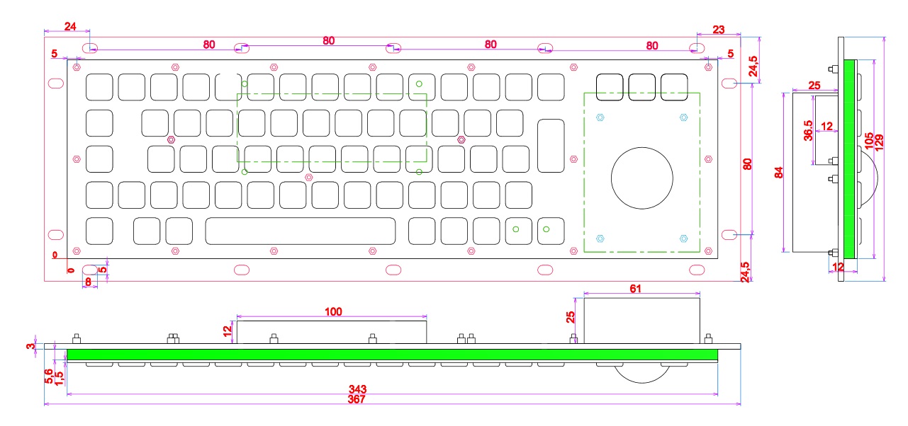 K-TEK-A343-MTB Антивандальная влагозащищённая металлическая клавиатура 67 клавиш с трекболом, серебристого цвета, монтаж в панель, IP65