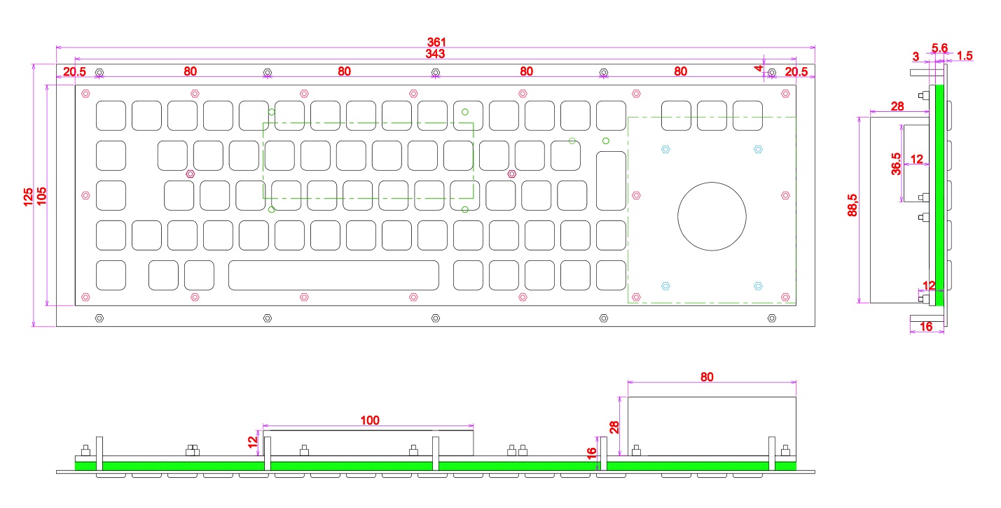 K-TEK-A361TP Антивандальная влагозащищённая металлическая клавиатура 69 клавиш с тачпадом, серебристого цвета, монтаж в панель, IP65