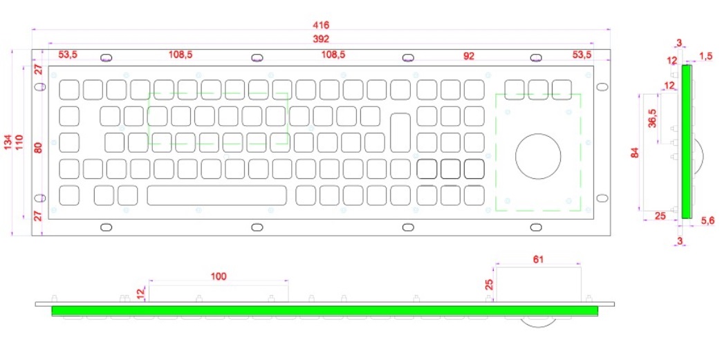 K-TEK-A392-MTB-KP-BL Антивандальная влагозащищённая металлическая клавиатура 84 клавиши с трекболом и подсветкой , серебристого цвета, монтаж в панель, IP65