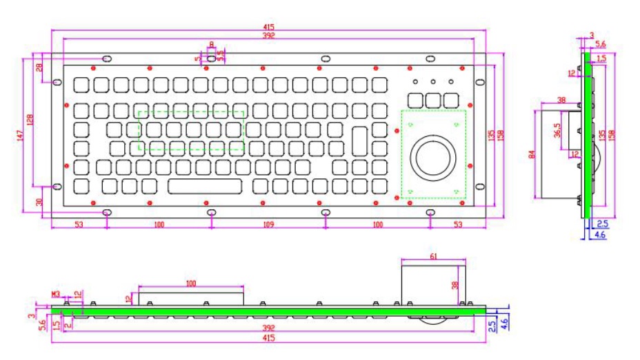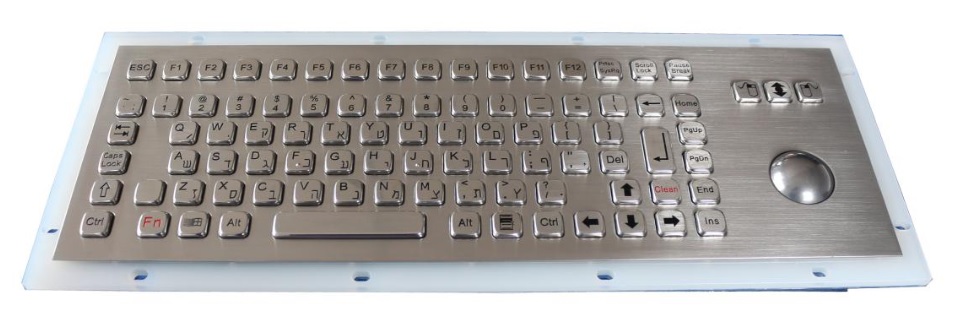 K-TEK-A392-OTB-FN-DWP Антивандальная влагозащищённая металлическая клавиатура 91 клавиша с трекболом, серебристого цвета, монтаж в панель, IP67