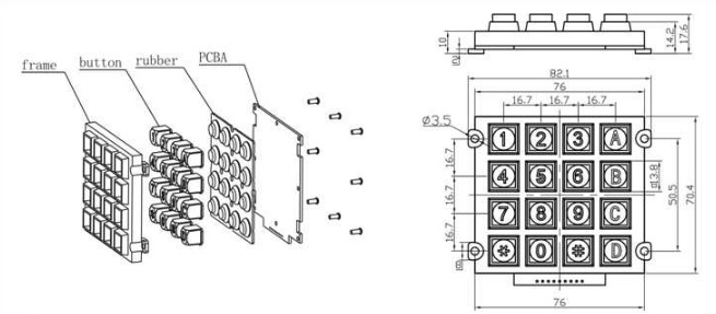 K-TEK-A82KP-AC Матричная антивандальная влагозащищённая металлическая клавиатура, 16 клавиш, серебристого цвета, без контроллера