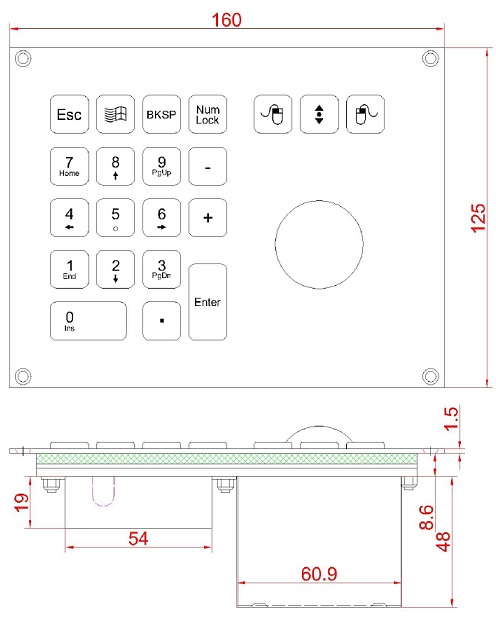 KP916 Антивандальная влагозащищённая металличесая клавиатура с трекболом, 21 клавиша