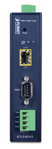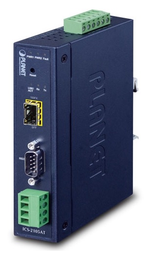 Planet ICS-2105ATПромышленный сервер COM портов 1xRS232/RS422/RS485, 1x100BASE-FX SFP , IP30, питание 9...48В DC / 24В AC с резервированием, расширенный диапазон температур -40...+75