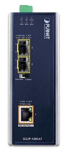 Planet IGUP-1205ATПромышленный медиаконвертер 2 порта 100/1000X SFP в 1 порт 10/100/1000T 802.3bt PoE++, расширенный диапазон температур -40...75, питание 12...56В DC с резервированием, IP30