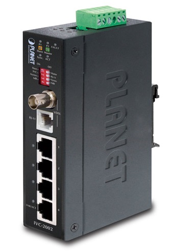 Planet IVC-2002 Промышленный удлинитель Ethernet, 4 порта 10/100Base-TX + 1 порт BNC / RJ-11, передача данных по коаксиальному или телефонному кабелю, расширенный диапазон температур - 40...+75, IP30
