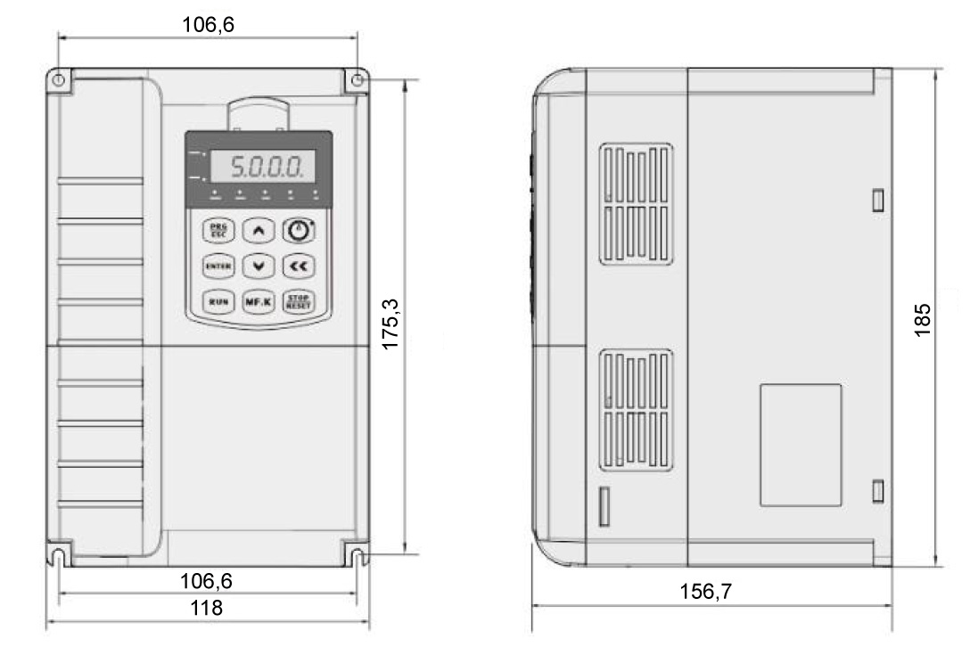 ES300-4T1K5G/2K2P Преобразователь частоты: номинальная мощность двигателя: 1,5/2,2 кВт, вход: 3 x 380 В 50/60 Гц; выход: 3 x 380 В, номинальный выходной ток 4,2/5,5 A; перегрузка: 120/150% 60c, 150/180% 3c