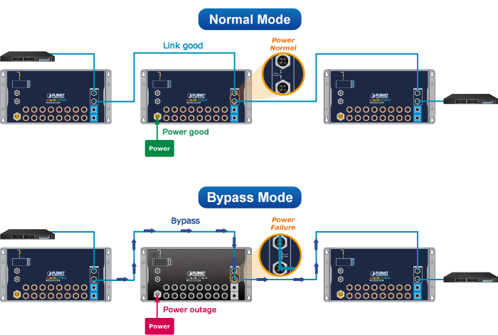 - Байпасное реле в коммутаторах: предотвращает потерю питания сети, переключая трафик на работающий коммутатор в случае сбоя. Это обеспечивает непрерывность работы сети при отключении электроэнергии.