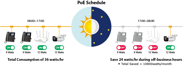 В условиях мирового тренда энергосбережения и вклада в защиту окружающей среды VCG-2406WP-NR может эффективно контролировать подачу питания помимо своей способности обеспечивать высокую мощность. Функция "Расписание PoE" помогает включать или отключать подачу питания PoE для каждого порта PoE в указанные временные интервалы, и это мощная функция для помощи малым и средним предприятиям или корпорациям в экономии энергии и бюджета. Она также повышает безопасность, отключая питание устройств, которые не должны использоваться в нерабочее время.